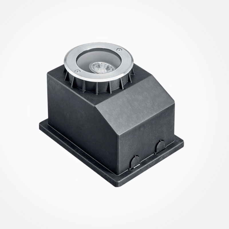 Hochwertiger Bodeneinbaustrahler aus glasfaserverstärktem Kunststoff und Edelstahl-Abdeckring.